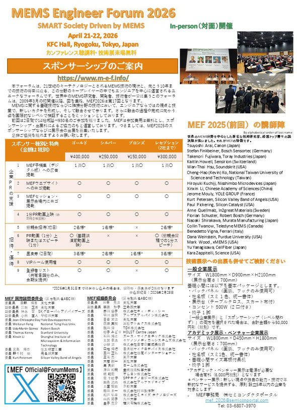 MEMS Engineer Forum (MEF) 2026が、4月21日(水)~22日(木)に開催されます。